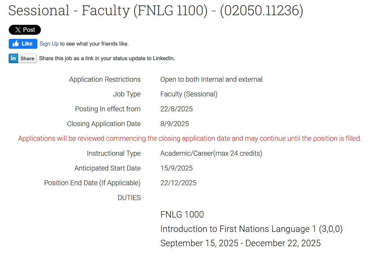 When you see a position of interest, click on that green highlighted link and more hiring information is displayed. The posting should tell you the job type (internal, external, contract or permanent hire), posting dates and start/end dates. In the example below, this position is sessional (short term contract) for the fall dates of Sept-Dec 2025.