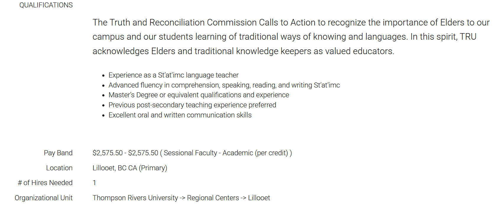 Next are the job qualifications. These are IDEAL qualifications set by the department's hiring committee and the university senate. This means this is what is required if one is to get a permanent position in that department and what the university senate wants to see as a minimum educational level. However, there are many instances, especially in rural campuses, where applicants are hired without those higher degrees. Often, an applicant with a lower expectation such as a bachelor's degree or a diploma may get shortlisted depending on application numbers and interest. Sometimes, the posting will actually say something like "other qualifications may be considered" or they may specify a lower, but acceptable qualification such as "applicants with a diploma may be considered". In the example below the position asks for a Masters degree OR equivalent qualifications and experience. If you do not have a Masters, your job is to show via your resume, that you have the "equivalent qualifications".