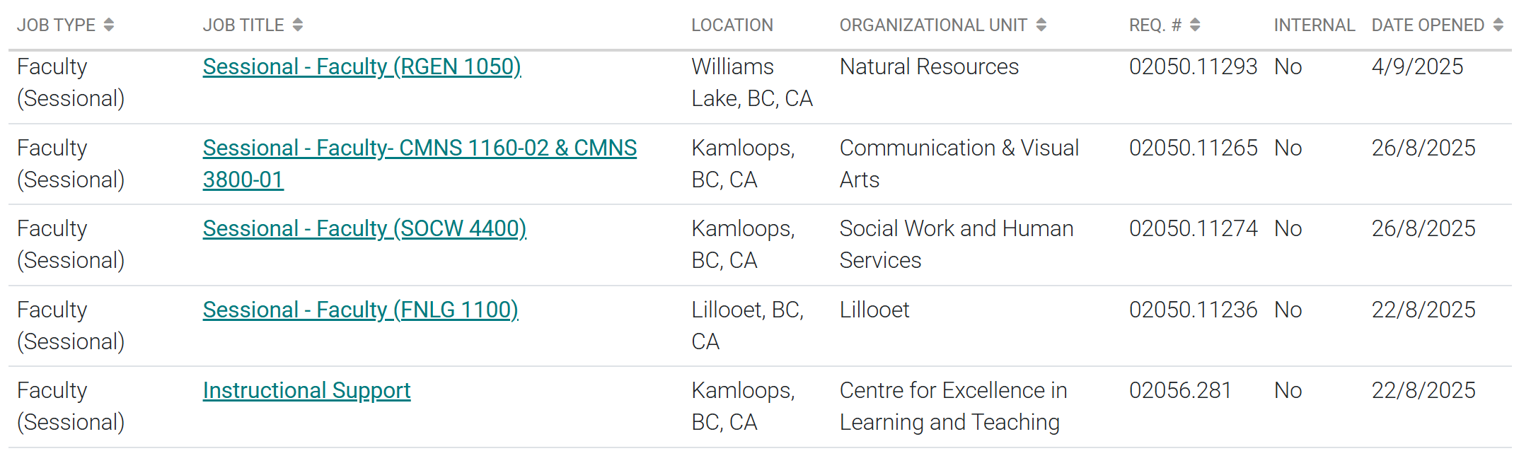 When seeking a teaching position, all openings will be available on the website for the institution typically under a title "careers" or "career opportunities". Select "faculty positions" and the list should be alphabetized according to the date that the position was posted (most current). In the example below, you can see the job type, title, location, program or organization and the date the posting opened.